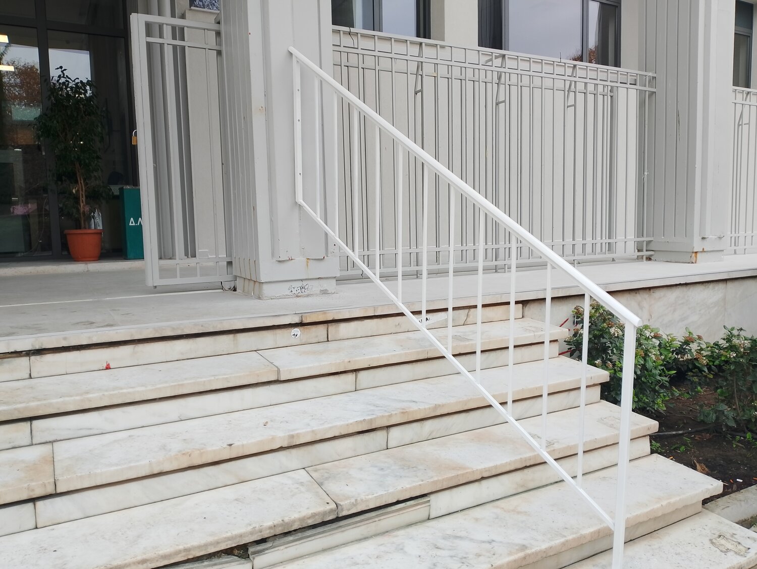 Παράλληλα τοποθετήθηκαν κάγκελα στα σκαλιά του Μεγάρου για να διευκολύνεται η πρόσβαση των πολιτών στο κτήριο. Να σημειωθεί πως ράμπα για άτομα με κινητικά προβλήματα υπάρχει στην πίσω πλευρά του Μεγάρου στο Τμήμα Μεταγωγών επί της οδού Παπακυριαζή.