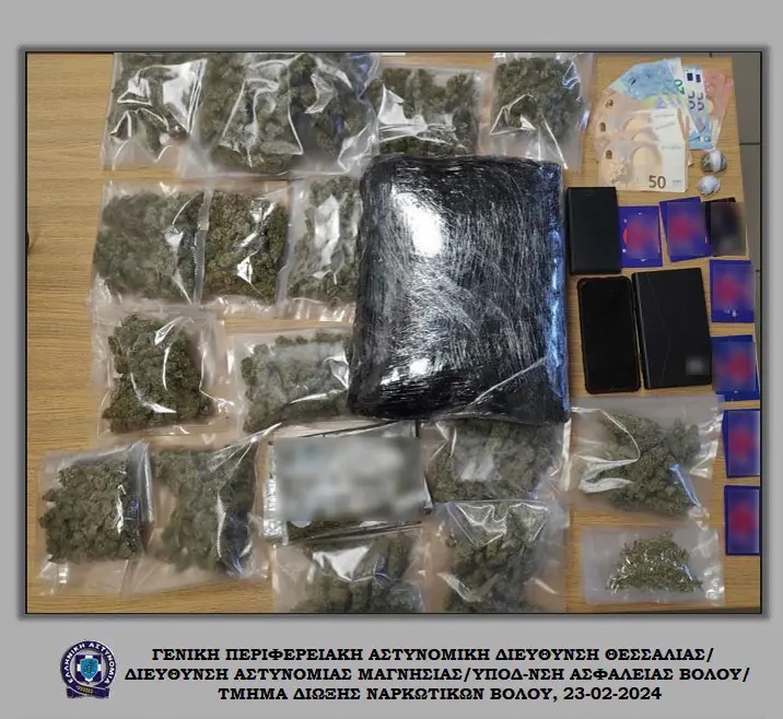 Συγκεκριμένα βρέθηκαν 19 νάιλον συσκευασίες με ποσότητες ακατέργαστης κάνναβης, συνολικού βάρους 2.179,4 γραμμαρίων, ένα γυάλινο βάζο με ποσότητα ακατέργαστης κάνναβης, βάρους 27,87 γραμμαρίων, δύο ζυγαριές ακριβείας, το χρηματικό ποσό των 400 ευρώ, ένα κινητό τηλέφωνο και εφτά πακέτα σύνδεσης κινητής τηλεφωνίας.