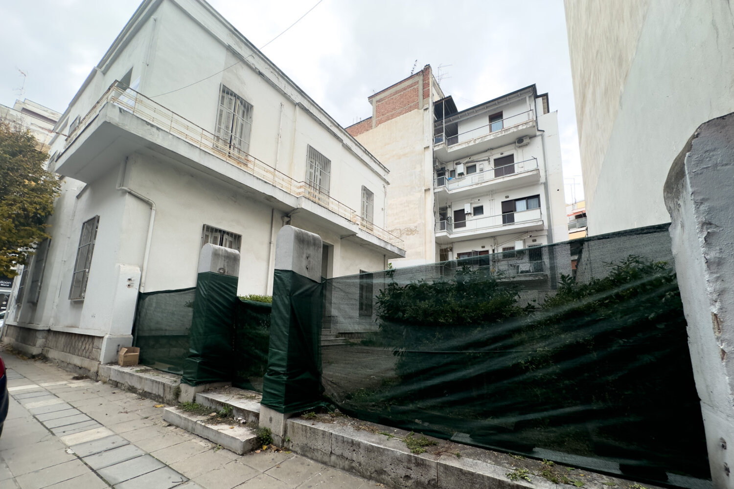 Όπως είναι εμφανές και από τα φωτογραφικά στιγμιότυπα, έχει απομακρυνθεί πλήρως η μεταλλική περίφραξη (θύρα που οδηγούσε στον περίβολο και κάγκελα) και στη θέση τους τοποθετήθηκε πράσινο πανί.
