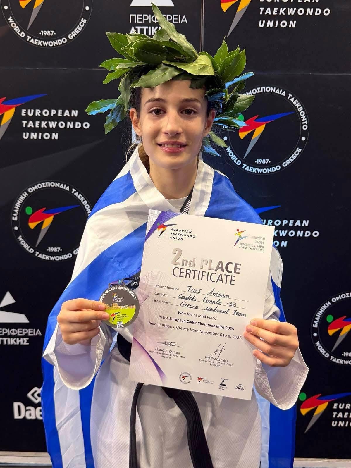 Με το εθνόσημο στο στήθος, η Αντωνία πραγματοποίησε μία από τις σημαντικότερες εμφανίσεις της καριέρας της στο Πανευρωπαϊκό Πρωτάθλημα Παίδων – Κορασίδων, που διεξήχθη στην Παιανία από τις 6 έως τις 8 Νοεμβρίου 2025. Με τέσσερις αγώνες υψηλής έντασης και απαιτήσεων, κατέκτησε το αργυρό μετάλλιο, γράφοντας ιστορία όχι μόνο για τον Σύλλογο και την πόλη της, αλλά και για το ελληνικό Τάεκβοντο συνολικά. Αξίζει να τονιστεί ότι η Αντωνία ήταν η μικρότερη ηλικιακά αθλήτρια της κατηγορίας της, γεγονός που κάνει την επιτυχία της ακόμη πιο εντυπωσιακή.