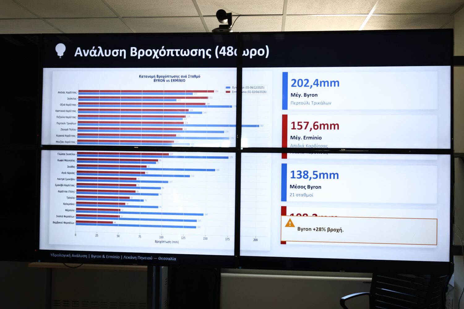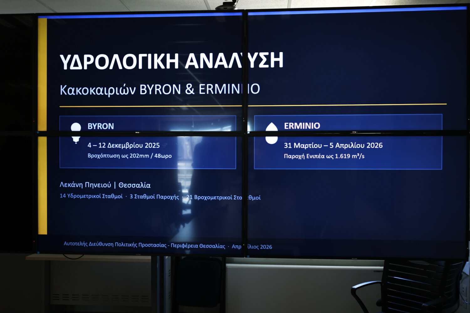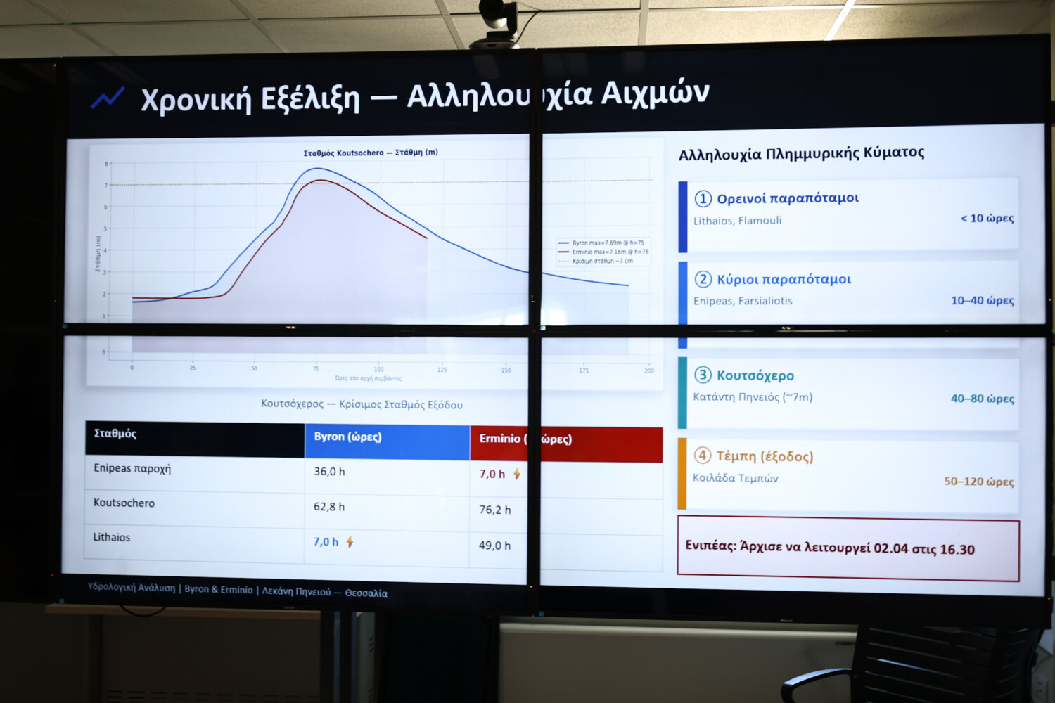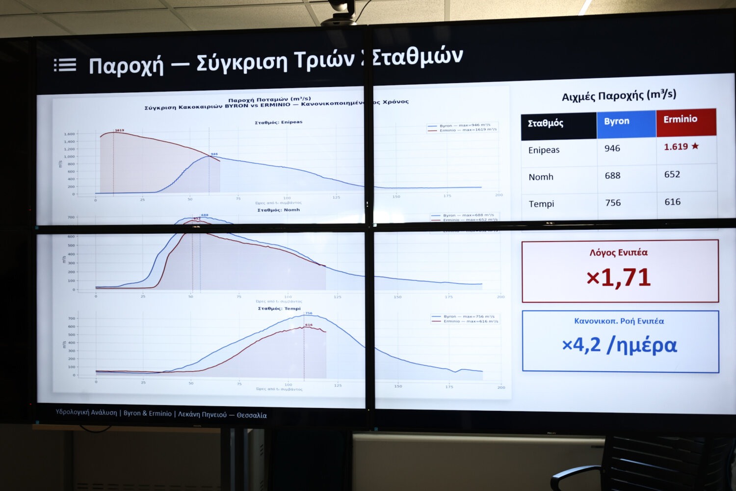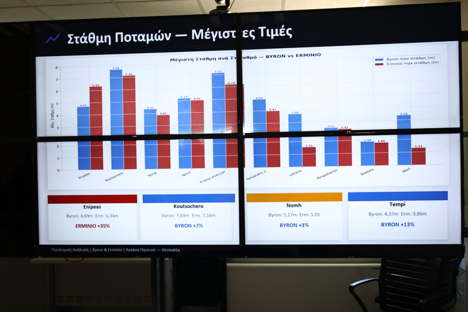 Βασικό συμπέρασμα, σύμφωνα με τον κ. Κουρέτα, είναι πως ενώ ο Erminio προσέγγισε σε όγκο νερού τον Byron, αυτό δεν έφερε εκτεταμμένες πλημμυρισμένες εκτάσεις… «Στον Erminio καταγράφηκαν ελάχιστα πλημμυρισμένα στρέμματα και αυτά στην ευρεία κοίτη του Πηνειού. στον Byron ήταν 18.000 πλημμυρισμένα στρέμματα και στον Ιανό 298.000 πλημμυρισμένα στρέμματα. Αυτό δείχνει πως η δουλειά που γίνεται αποδίδει» τόνισε ο περιφερειάρχης Θεσσαλίας.
