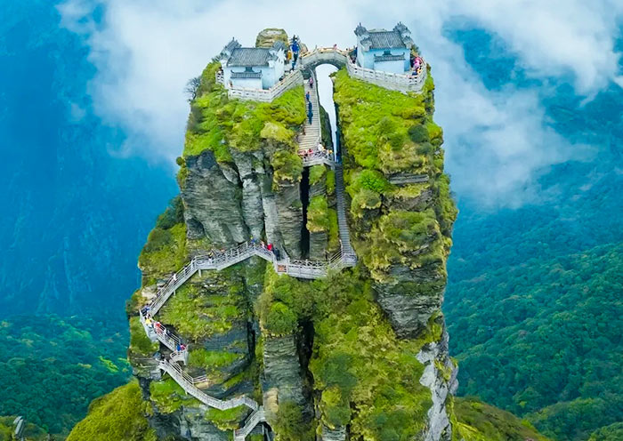 Η δεύτερη είναι το Όρος Φαντζίνγκ (Fanjingshan), ένα ιερό βουνό με εντυπωσιακούς ναούς στην κορυφή. Βρίσκεται στην επαρχία Γκουιτζόου (Guizhou) στη νοτιοδυτική Κίνα και αποτελεί την υψηλότερη κορυφή των βουνών Γουλίνγκ (Wuling) με υψόμετρο 2.570 μέτρα. Είναι παγκοσμίως γνωστό για τον «Χρυσό Βράχο των Κόκκινων Συννέφων», όπου δύο ναοί είναι χτισμένοι πάνω σε δύο απόκρημνες κορυφές, οι οποίες ενώνονται με μια μικρή γέφυρα. Θεωρείται ιερό βουνό του Κινεζικού Βουδισμού και είναι Μνημείο Παγκόσμιας Κληρονομιάς της UNESCO από το 2018. Αποτελεί σημαντικό τουριστικό αξιοθέατο και οι επισκέπτες μπορούν να φτάσουν στην κορυφή μέσω τελεφερίκ ή ανεβαίνοντας χιλιάδες σκαλοπάτια.