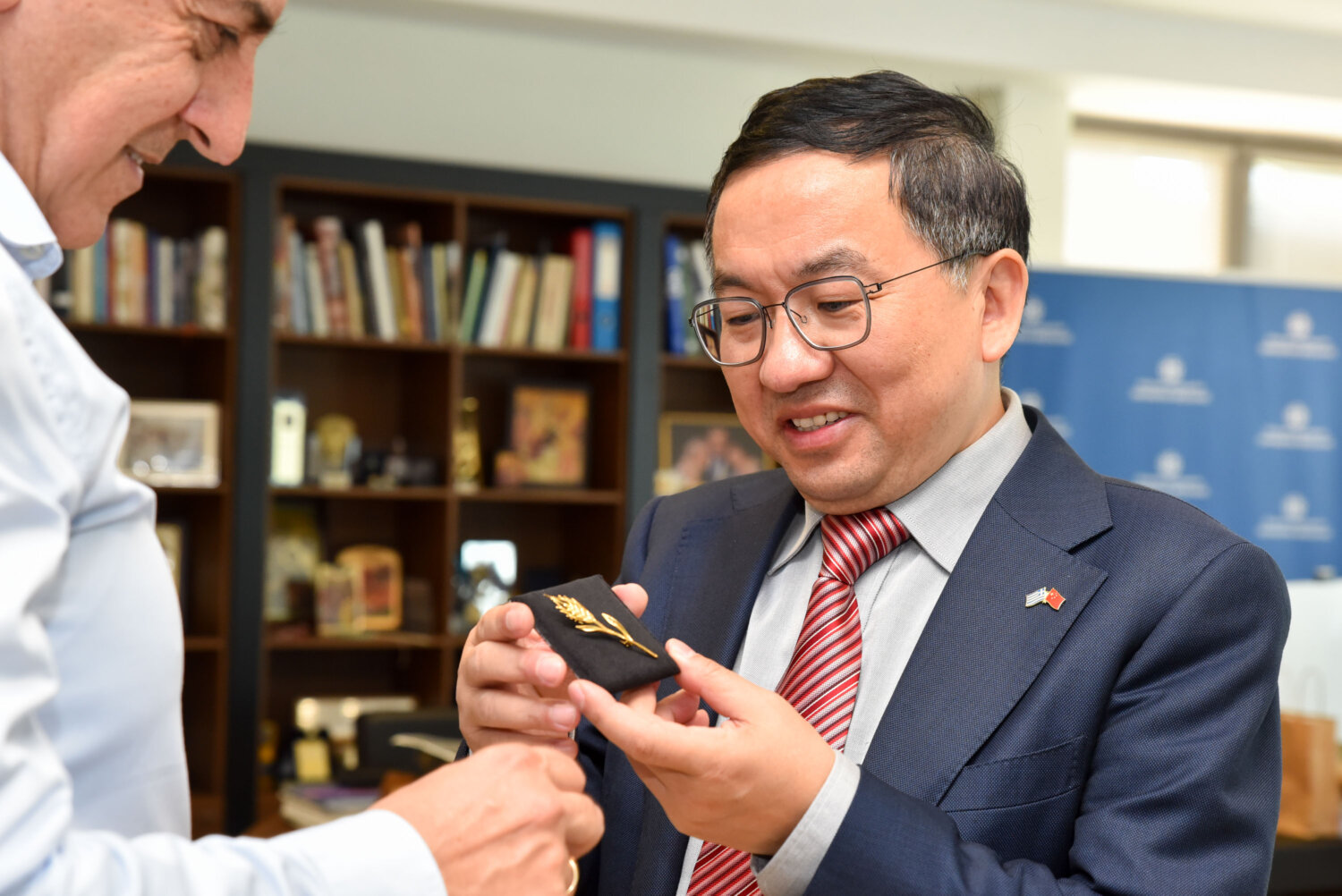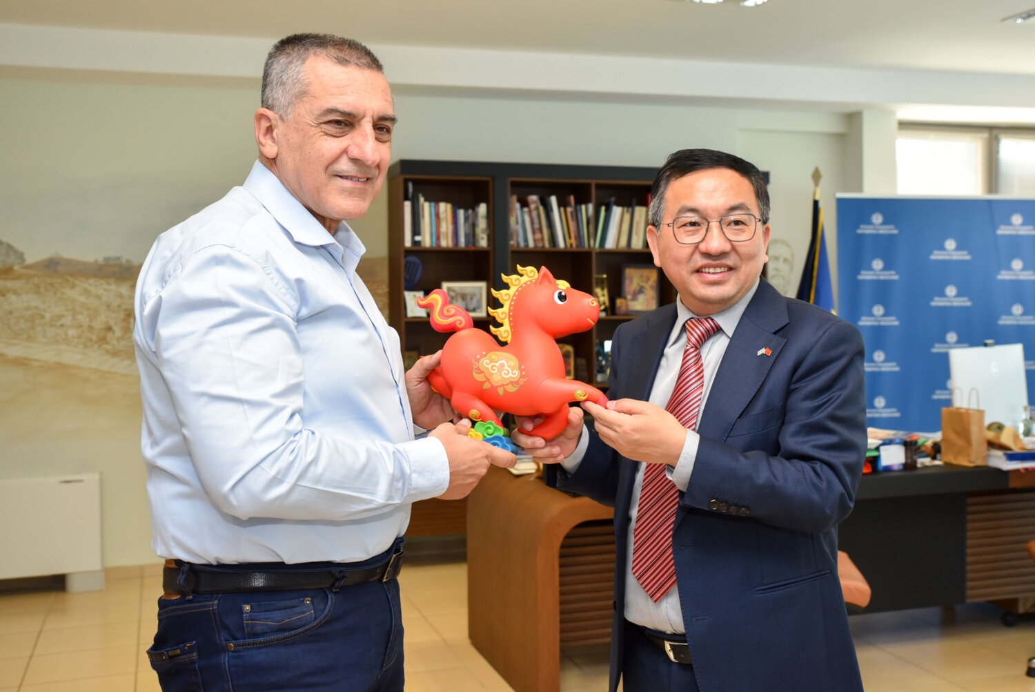 Η συνάντηση ολοκληρώθηκε με την ανταλλαγή δώρων. Συγκεκριμένα ο κ. Κουρέτας χάρισε στον Πρέσβη της Κίνας μια καρφίτσα σε σχήμα στάχυ που αποτελεί το σύμβολο της Θεσσαλίας και εκείνος με τη σειρά του ανταπέδωσε ένα άλογο, καθώς φέτος στην Κίνα είναι η χρονιά του αλόγου, και ένα κινέζικο ημερολόγιο.