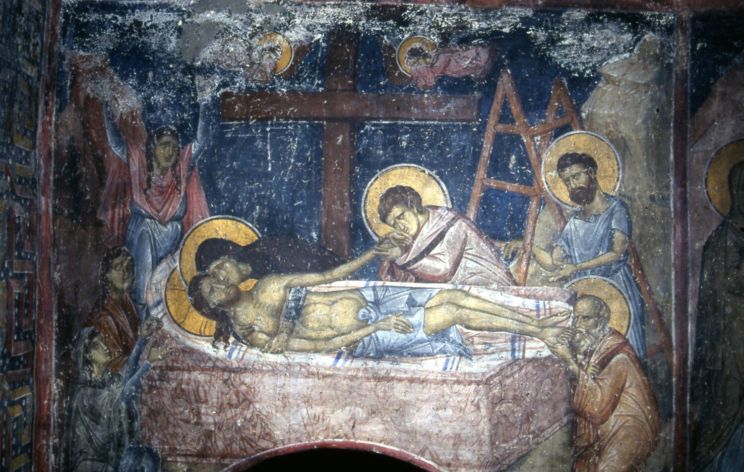 Η παρουσία των Μυροφόρων, ιδιαίτερα πολυάριθμη στην παλαιολόγεια ζωγραφική, εδώ περιορίζεται σε τρείς μορφές, που θρηνούν με ιδιαίτερα εκφραστικές κινήσεις, ιδίως εκείνη στο βάθος, που αποδίδει τη Μαρία Μαγδαληνή.