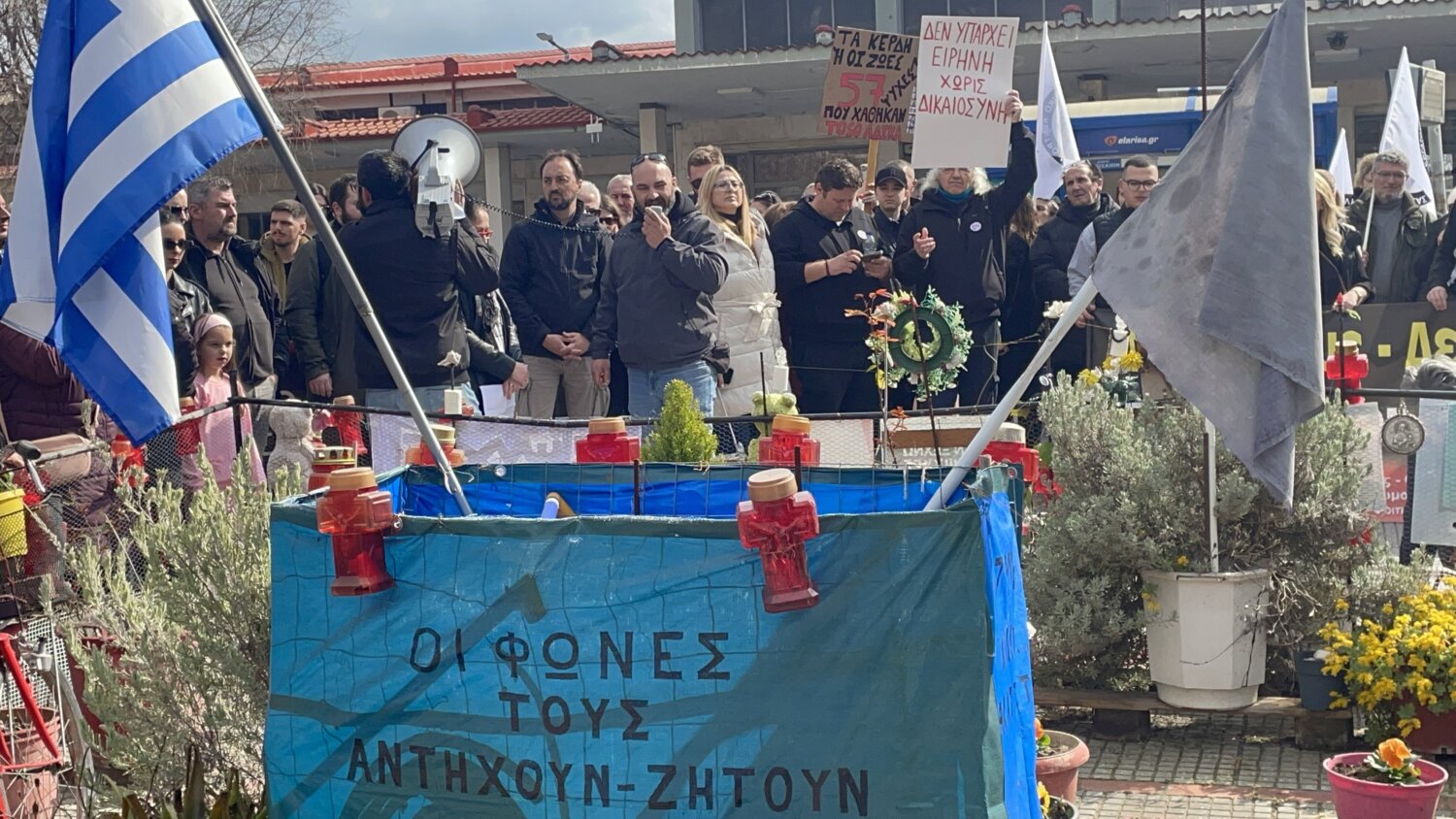 Λίγο πριν τις δύο το μεσημέρι η κορυφή της πορείας έφτασε στον Σιδηροδρομικό Σταθμό της Λάρισας όπου μπροστά από το μνημείο των Τεμπών διαβάστηκαν τα 57 ονόματα ενώ κρατήθηκε κι ενός λεπτού σιγή για τους νεκρούς της σιδηροδρομικής τραγωδίας.