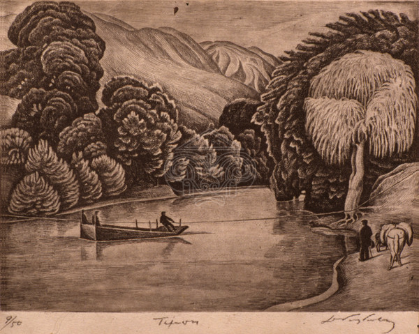 Έτσι και εδώ, η προσπάθεια των χωρικών να σταθεροποιήσουν την ξύλινη βάρκα τους μέσα στα νερά του ποταμού πλαισιώνεται από το μεγαλοπρεπές φυσικό σκηνικό που αποδίδεται με την οξεία παρατηρητικότητα του Γιολδάση.